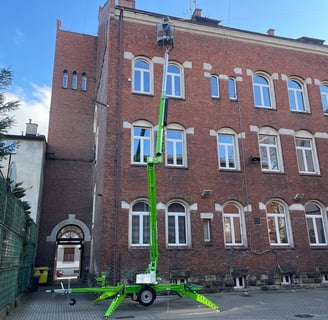 Prace na wysokościach: Montaż i demontaż konstrukcji, prace remontowe i wykończeniowe, czyszczenie elewacji, mycie okien, malowanie.