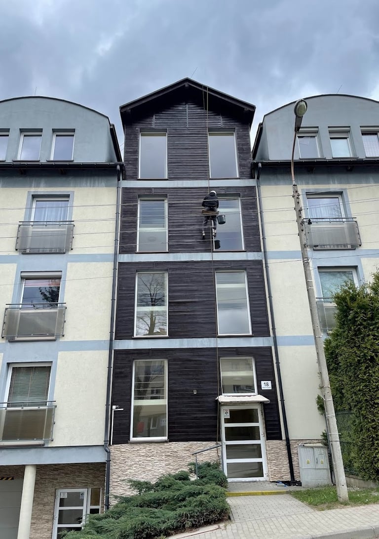 Prace na wysokościach: Montaż i demontaż konstrukcji, prace remontowe i wykończeniowe, czyszczenie elewacji, mycie okien, malowanie.